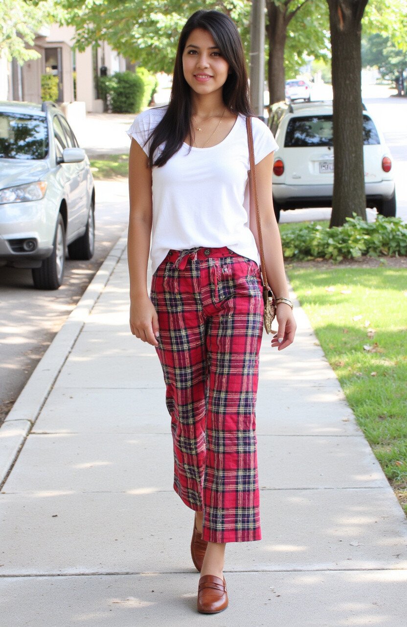 Plaids bring a touch of sophistication to any outfit. A plaid skirt or pants with a plain top is a preppy classic.