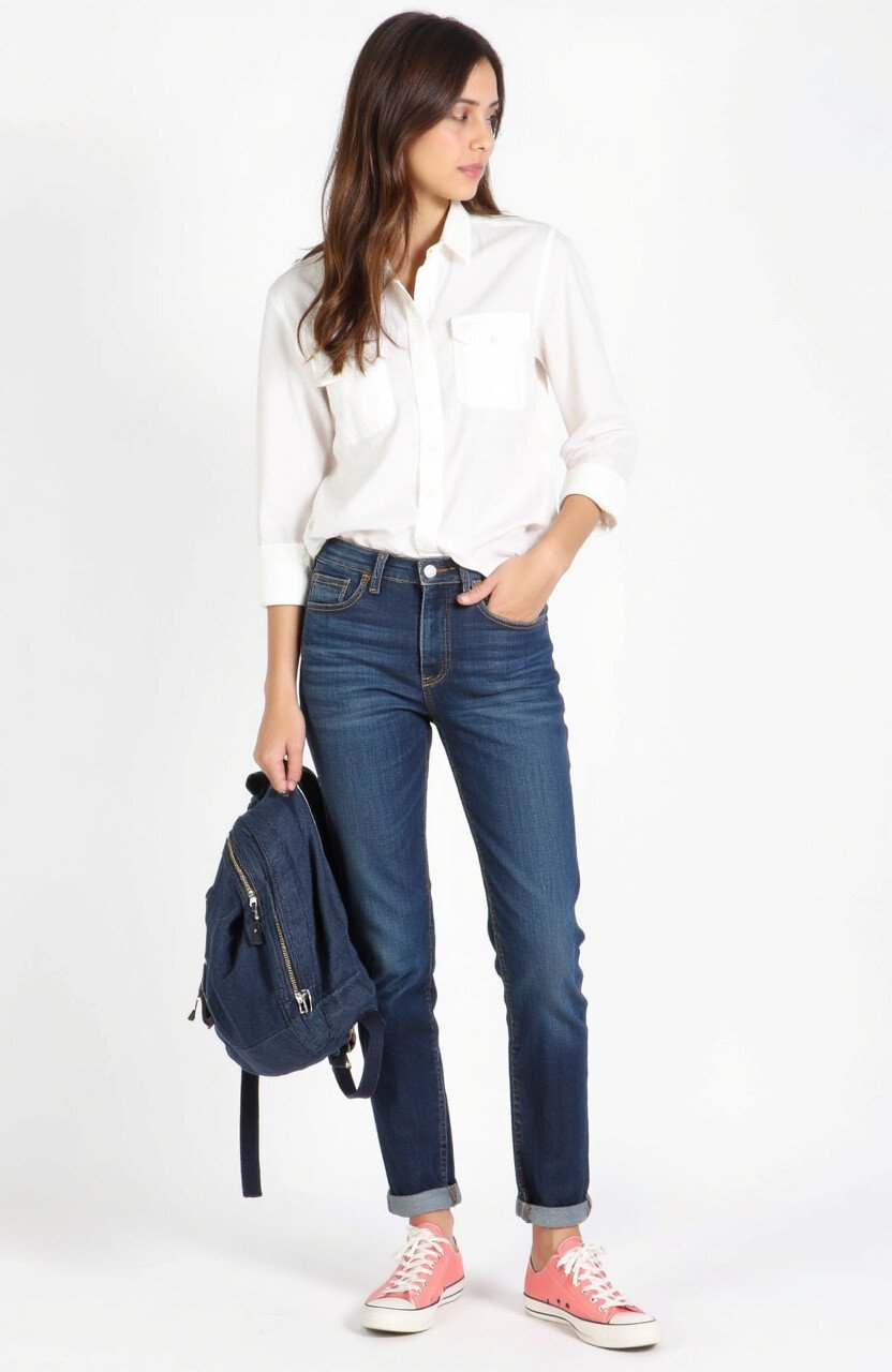 Denim never goes out of style. Pair your favorite jeans with a crisp white shirt for a timeless look. Add a pop of color with bright sneakers or a fun backpack.
