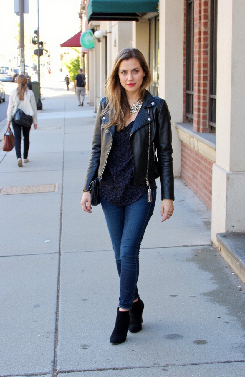 Complete the look with ankle boots or stilettos for extra flair. A bold lip color can add an extra pop of glamour. Opt for a fitted leather jacket for a polished look.