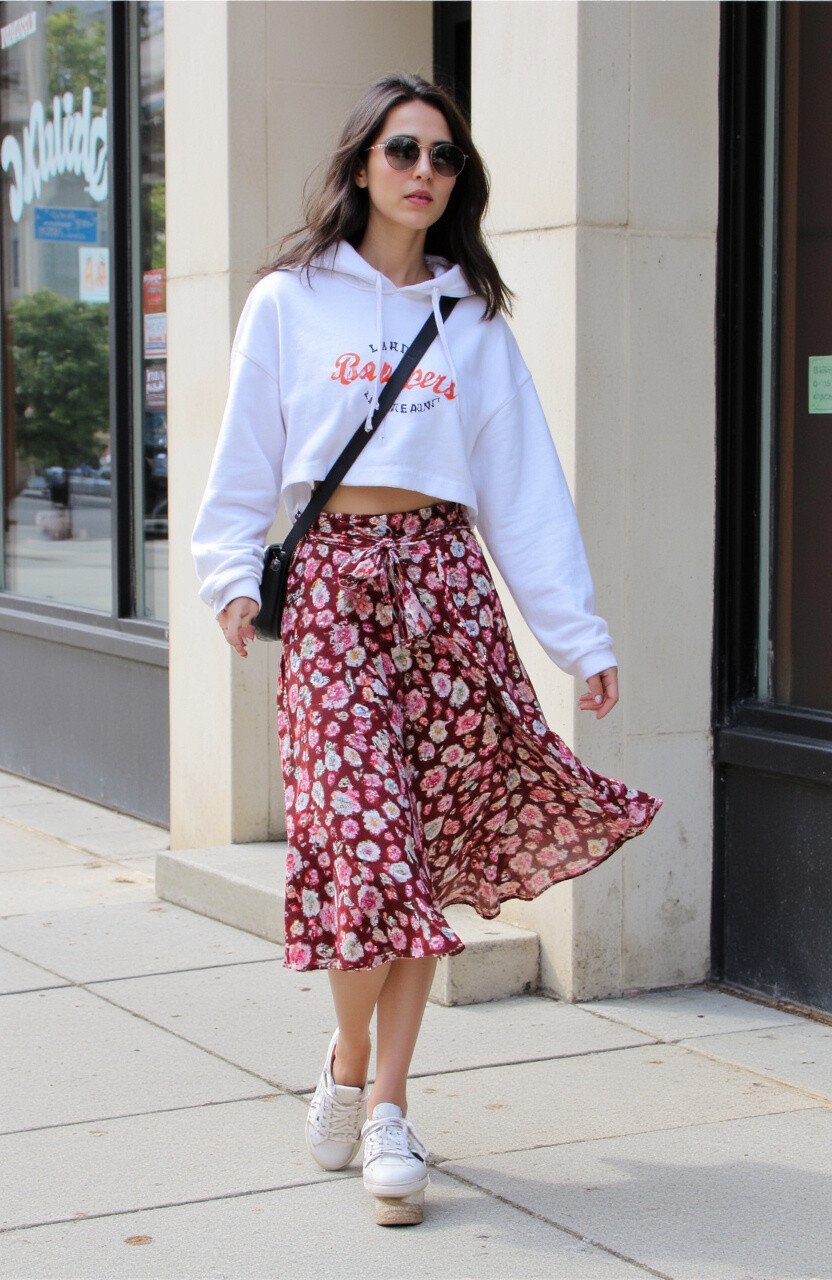 Cropped hoodies are affordable, starting at $20, and high-waisted skirts can be found for around $25, making this a fun and trendy outfit choice.