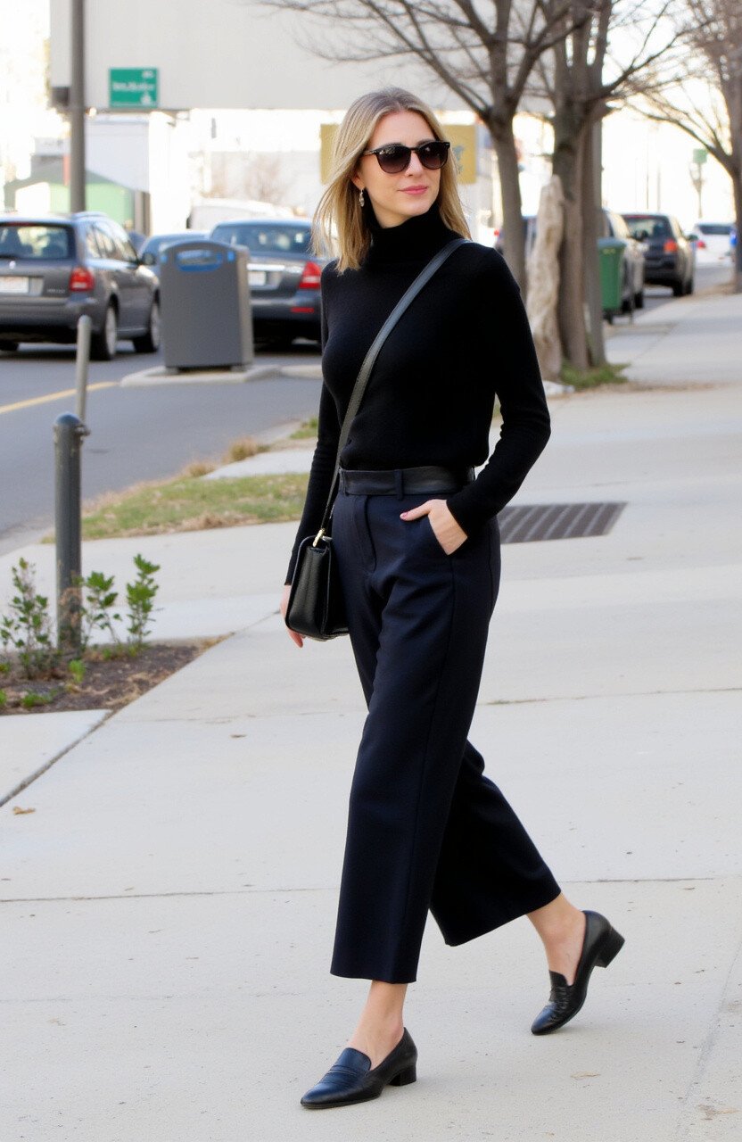 A turtleneck with wide-leg pants is all about comfort and style. This outfit is perfect for transitioning between seasons. The turtleneck provides warmth, while the wide-leg pants offer a breezy feel.