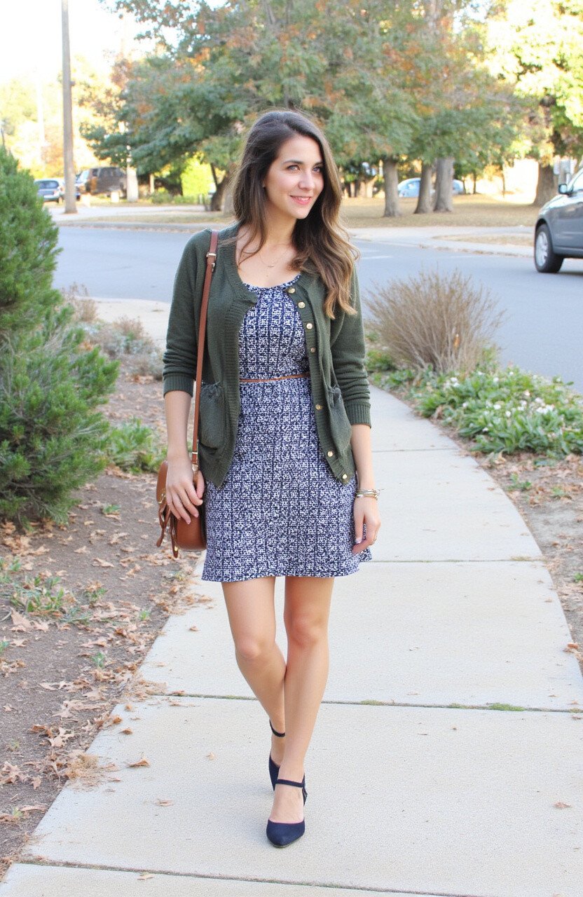 A cardigan layered over a printed dress is a cozy and stylish combination. It’s perfect for transitional weather, providing warmth without sacrificing style. This outfit is feminine and fun, ideal for any casual occasion.