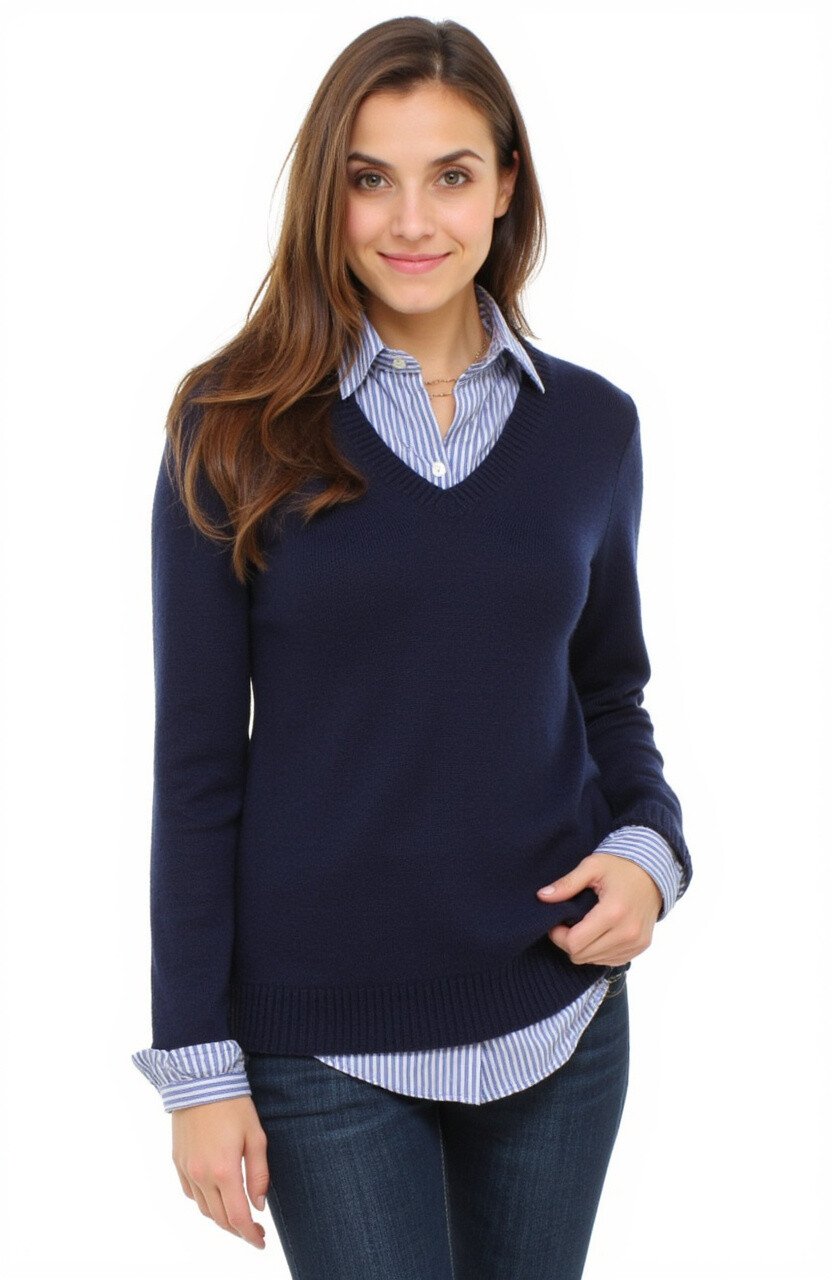 Experiment with different color combinations to express your style. This outfit is versatile and can be paired with jeans or trousers. V-neck sweaters and collared shirts are widely available, accommodating various budgets.