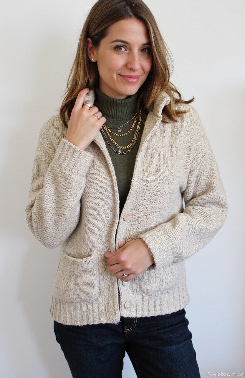 A turtleneck is a staple for cooler months, and pairing it with layered necklaces adds a touch of elegance. This outfit is both cozy and chic, offering warmth and style in one package.