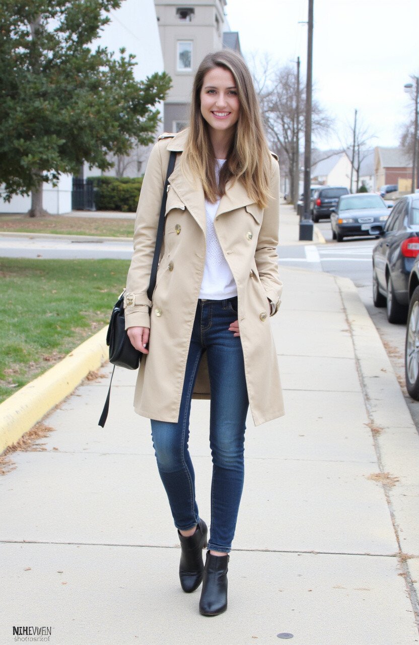This outfit allows for endless customization. Choose a brightly colored trench to make a statement or stick with neutral tones for versatility. Trench coats and ankle boots are available in a range of styles and prices, ensuring there’s something for everyone.