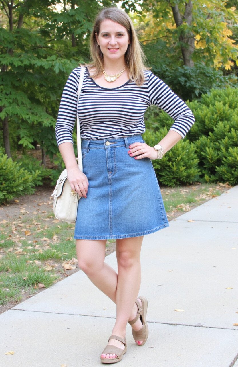 A striped shirt paired with a denim skirt is a playful and timeless look. It’s perfect for casual outings or a day at the park. This outfit is both fun and fashionable, offering a touch of whimsy to your wardrobe.
