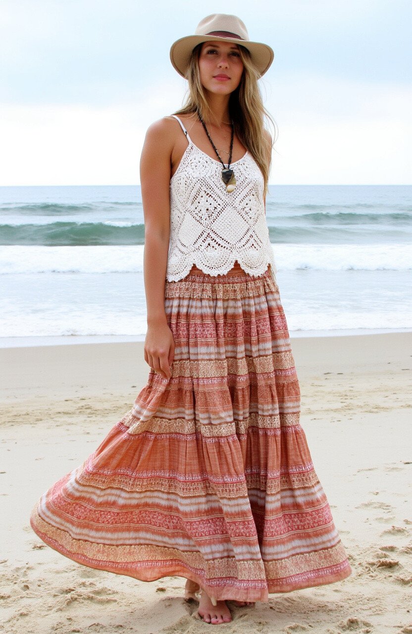 Feel the freedom of the waves in a flowing bohemian maxi skirt paired with a delicate crochet top. This outfit is all about peace, love, and good vibes. It’s perfect for twirling along the shoreline.