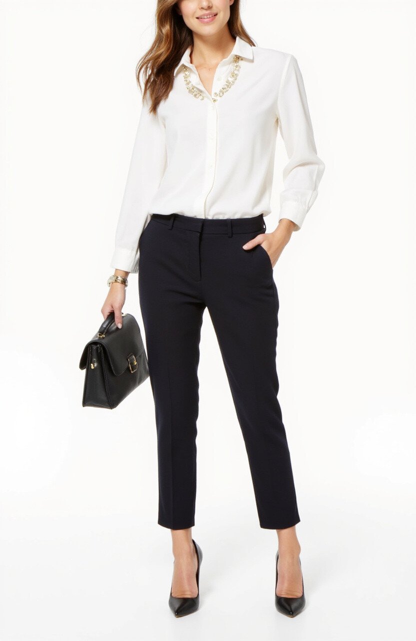 Look professional and stylish with a chic office outfit that includes tailored trousers, a crisp blouse, and pointed-toe heels. Ideal for a day at the office or a business meeting.