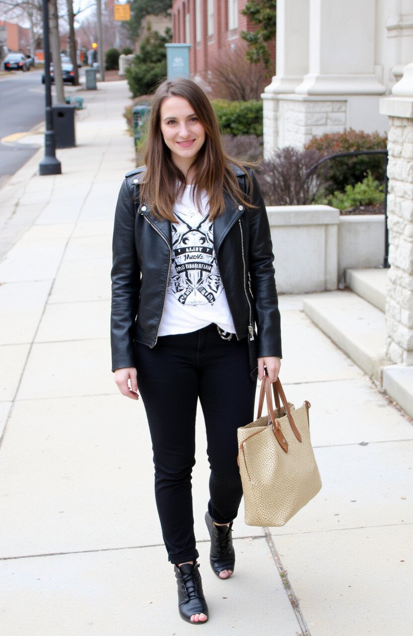 Bring out your inner rock star with a leather jacket paired with black jeans and a graphic tee. This outfit is perfect for a night out or a concert.