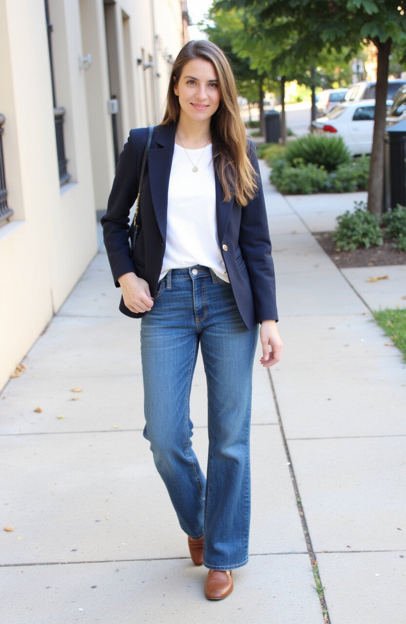 Picture this: a perfectly fitted pair of high-waisted jeans paired with a soft white tee. Add a tailored blazer and some sleek loafers, and you’re ready for anything. This outfit is both comfy and stylish—ideal for a day out or a casual office look.