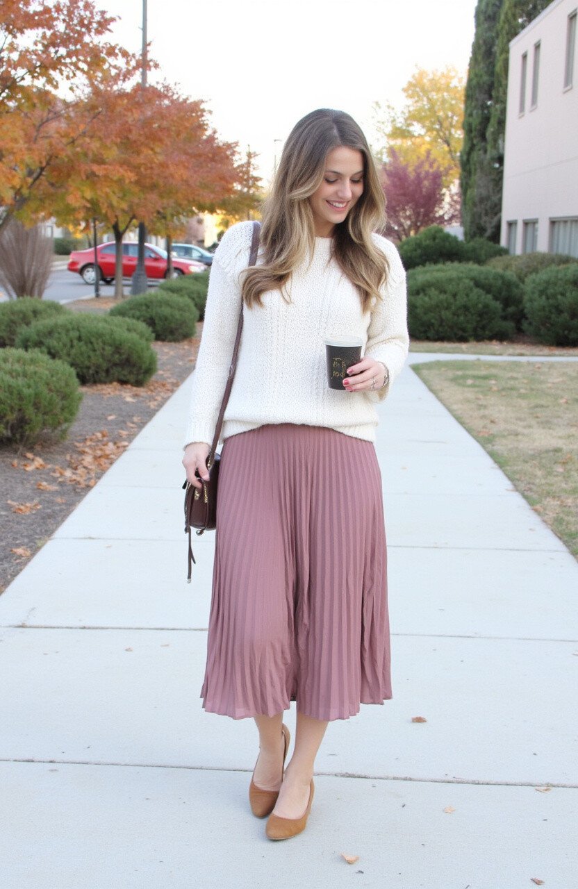 Combine comfort and style with a cozy knit sweater and a pleated midi skirt. This outfit is perfect for a day at the office or a lunch date with friends.