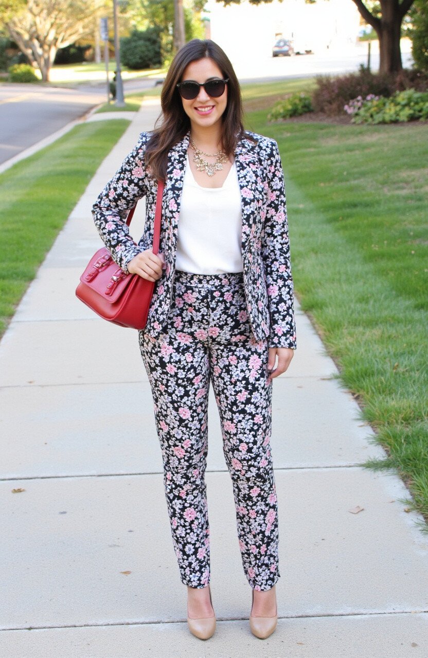 This outfit is great for making a statement at work or a special event. The suit’s structure gives a professional look, while the pattern keeps it lively.