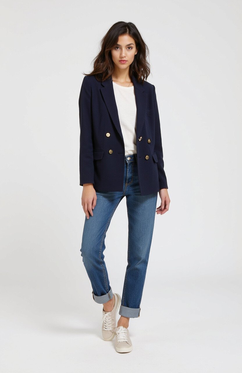 Denim is timeless, and when you pair it with a classic white tee, you’ve got a match made in heaven. The blazer adds a touch of sophistication, making it versatile for various settings. Keep it chic with minimal accessories, like a delicate necklace or small hoop earrings.