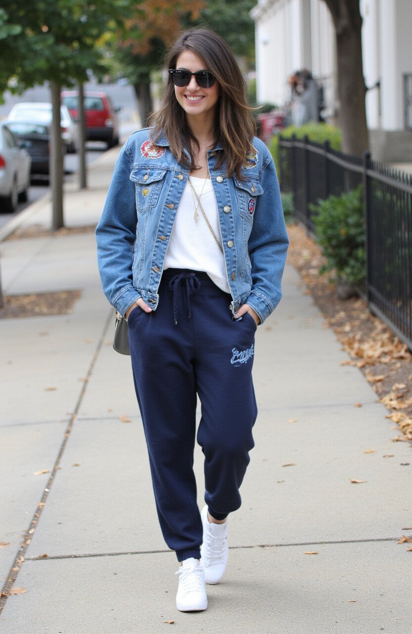 A denim jacket is always in style. Pair it with joggers for a relaxed yet put-together look. This combo is perfect for a day out with friends.
