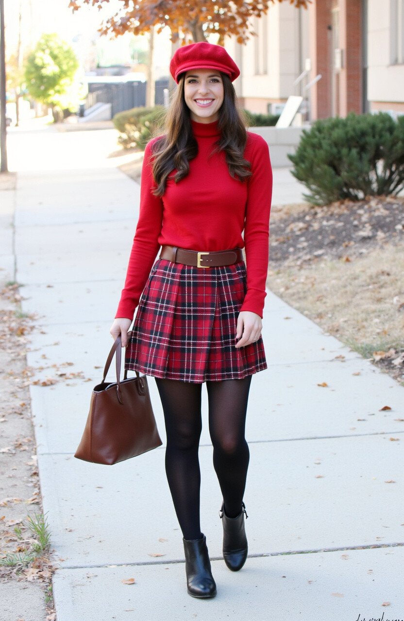 Embrace a classic winter look with a plaid skirt and turtleneck combination. This outfit is preppy and playful, perfect for a family-friendly gathering. Choose a skirt with a festive pattern and pair it with a solid-colored turtleneck.
