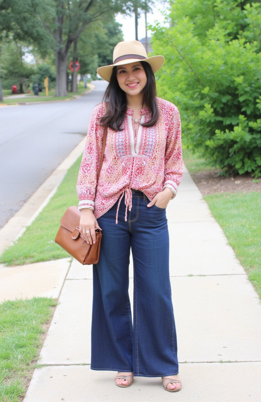 A peasant blouse paired with wide-leg pants offers a touch of boho charm. It’s relaxed and flowy.