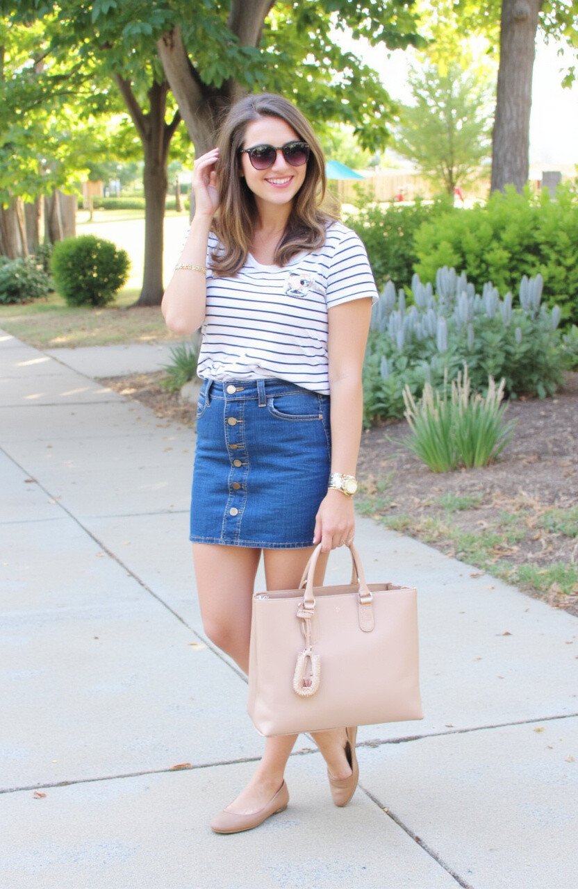 A striped t-shirt is a wardrobe staple that never goes out of style. Pair it with a denim skirt for a classic, easygoing look.