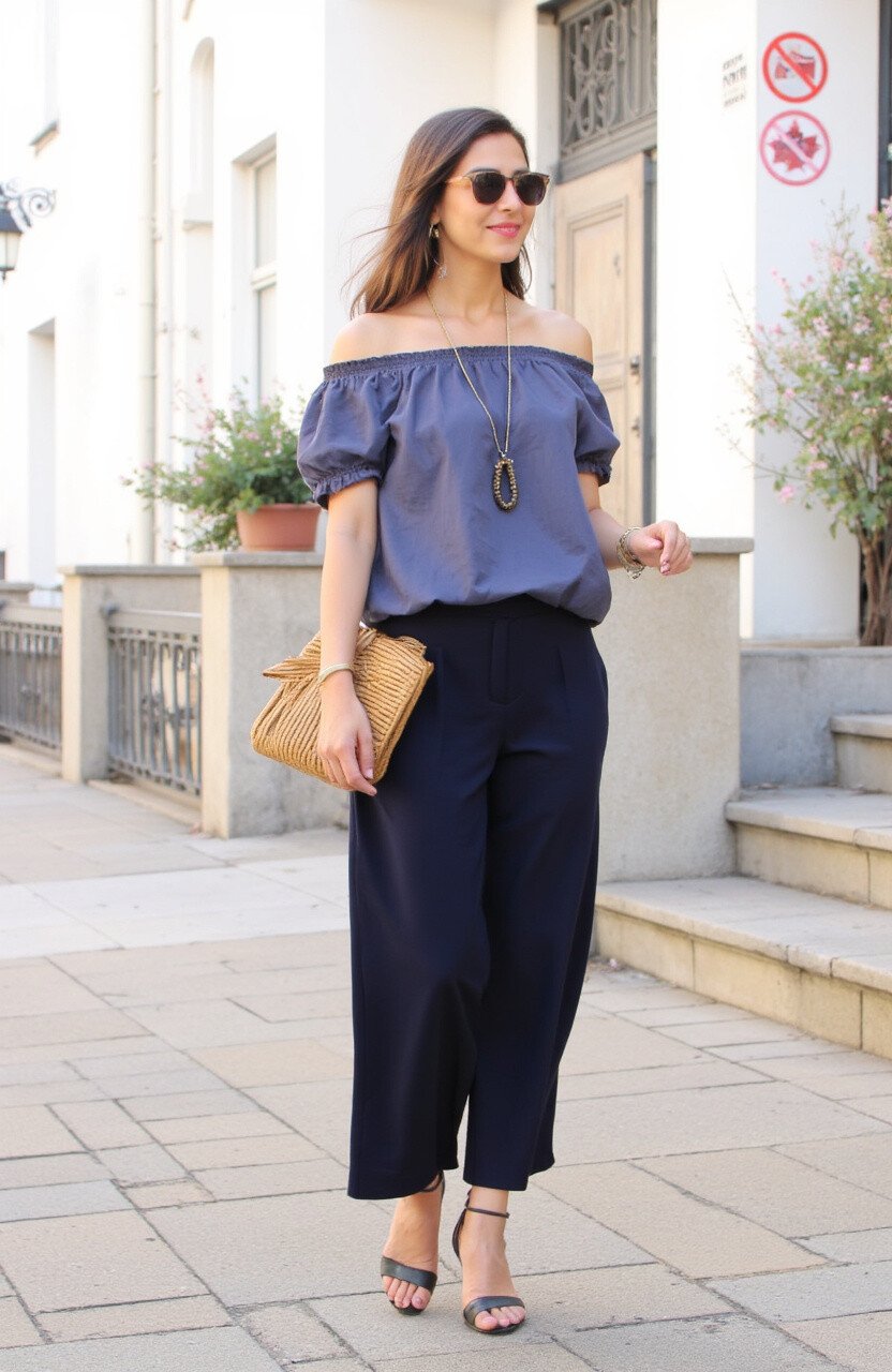 An off-shoulder top offers a touch of elegance when paired with culottes. It’s chic and comfortable.