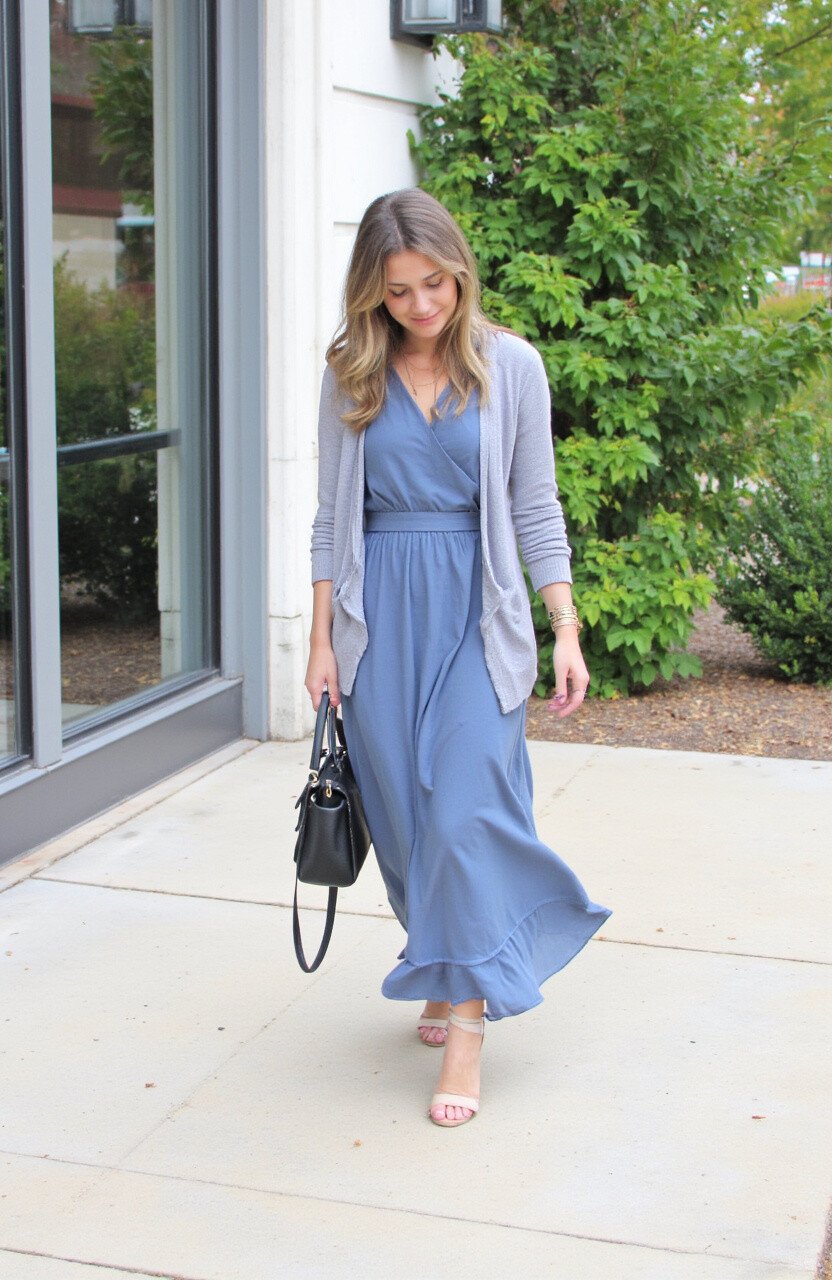 A flowy maxi dress paired with a cardigan is perfect for when you want to feel relaxed yet elegant.