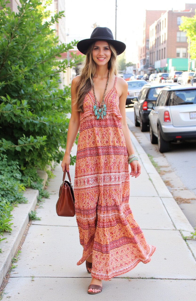 Choose a dress with intricate patterns or earthy tones. Add some beaded jewelry and a floppy hat for that true boho vibe.