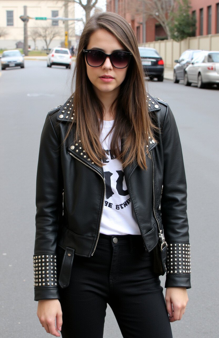 7. Studded Leather Jacket and Black Jeans