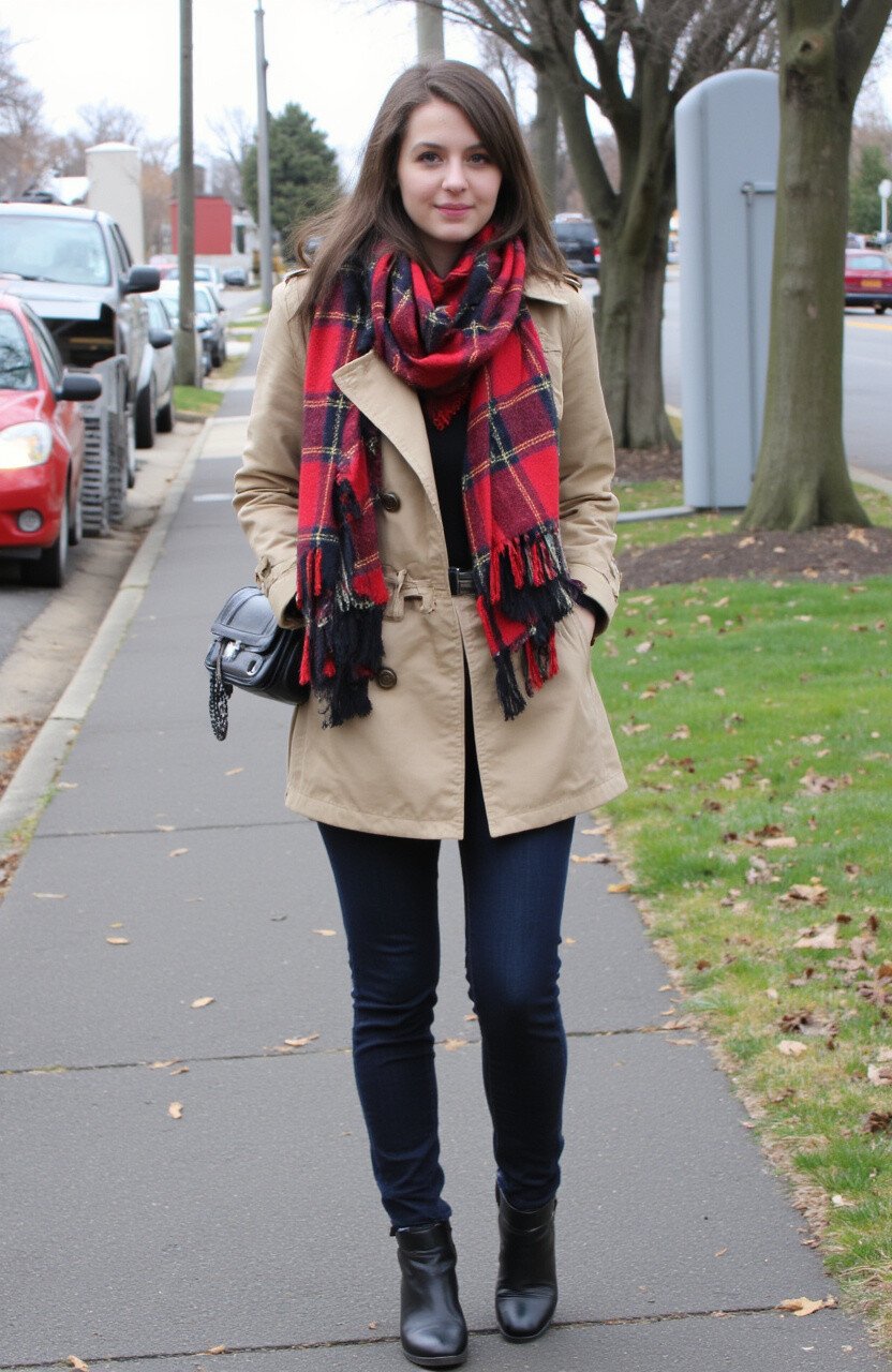 11. Trench Coat and Plaid Scarf
