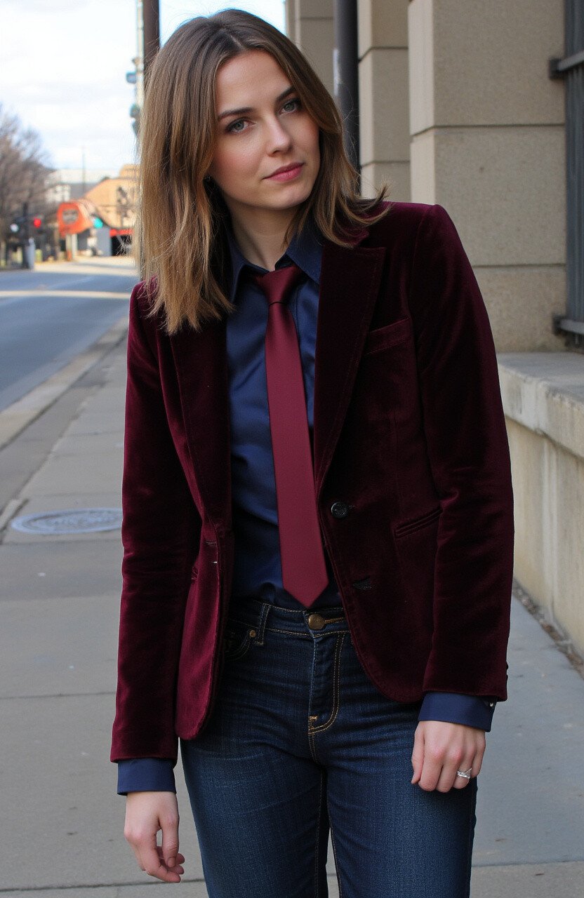 For a touch of sophistication, try a velvet blazer with a skinny tie. This combination is perfect for more formal occasions.