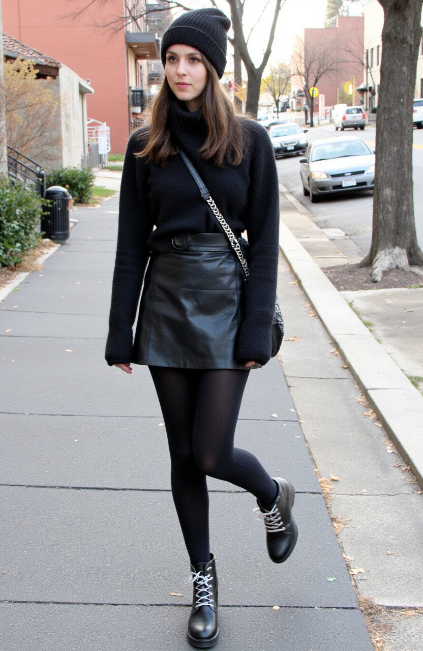 A knit beanie with a leather skirt offers a cozy yet edgy look. The beanie keeps you warm, while the skirt adds a touch of glam.