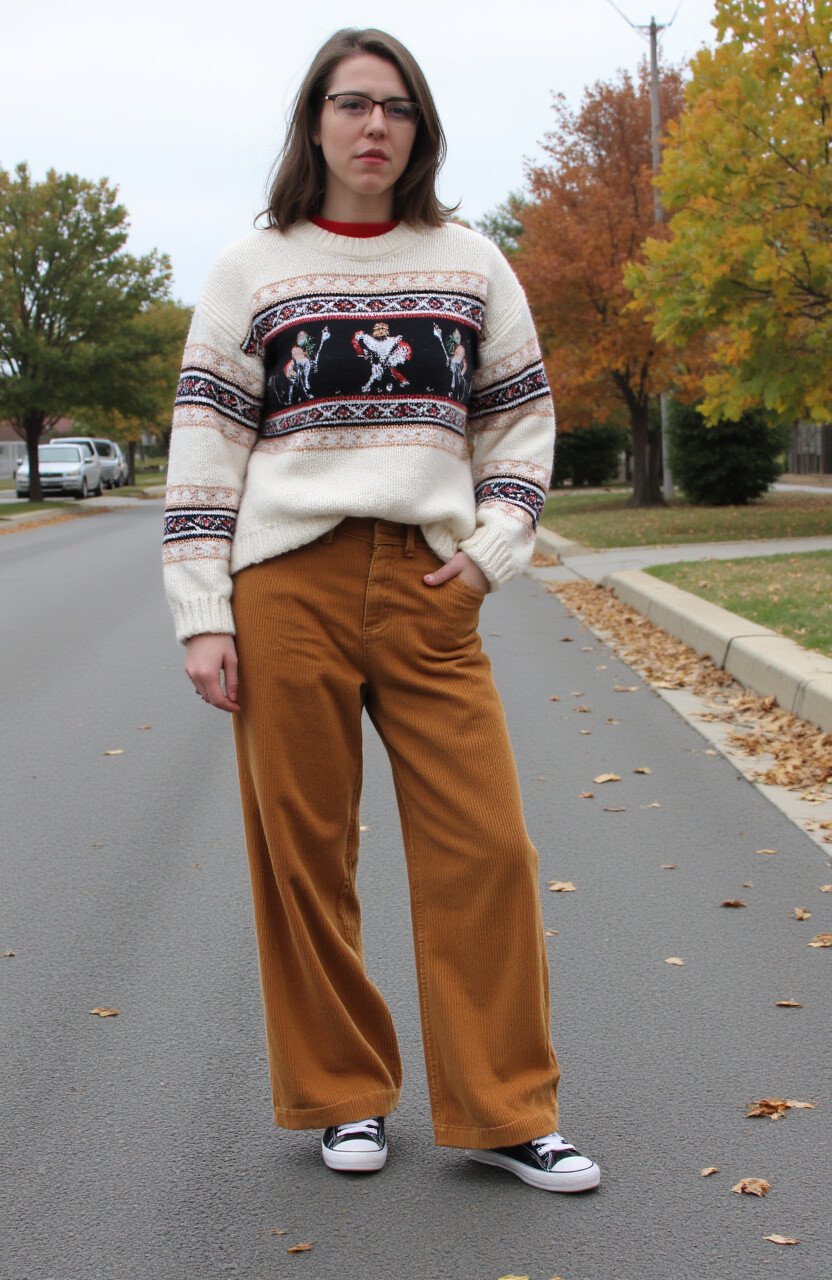 A vintage band sweater with corduroy pants gives a retro, laid-back vibe. The sweater’s nostalgia is perfect for music lovers.