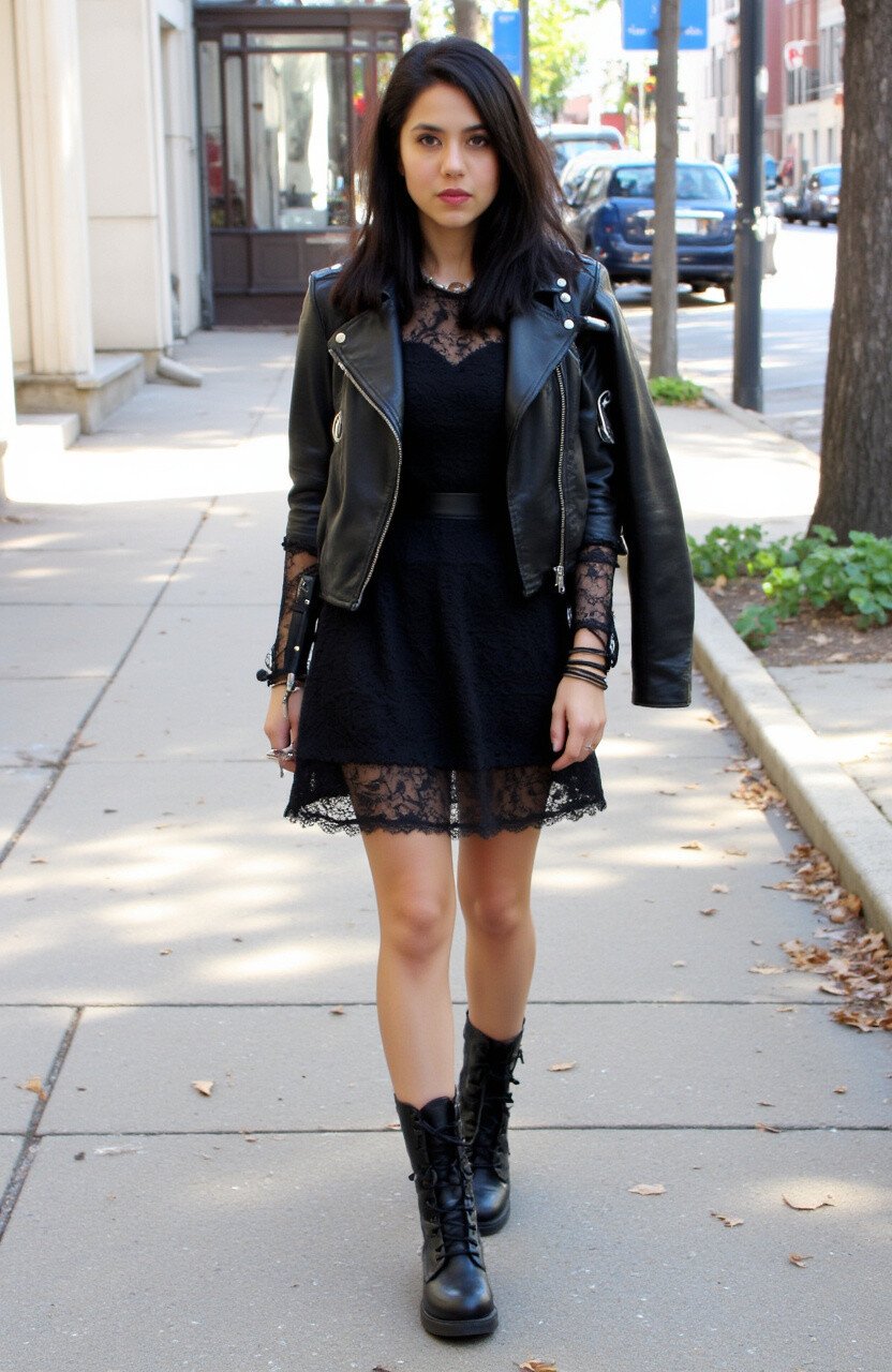 Embrace your dark side with a black lace dress paired with combat boots. The delicate lace contrasts beautifully with the ruggedness of the boots.