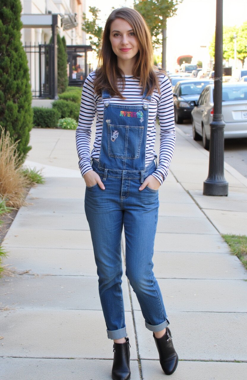 Denim overalls with a striped shirt offer a playful yet stylish look. The stripes add a retro touch to the casual vibe of the overalls.