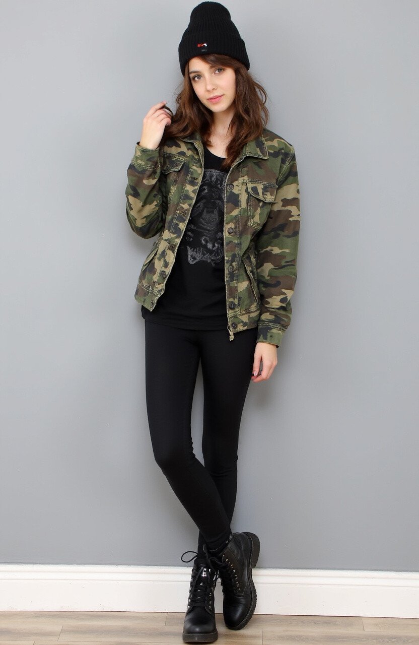 A camo jacket with black leggings offers a military-inspired look. The camo print is bold, while the leggings keep it casual.