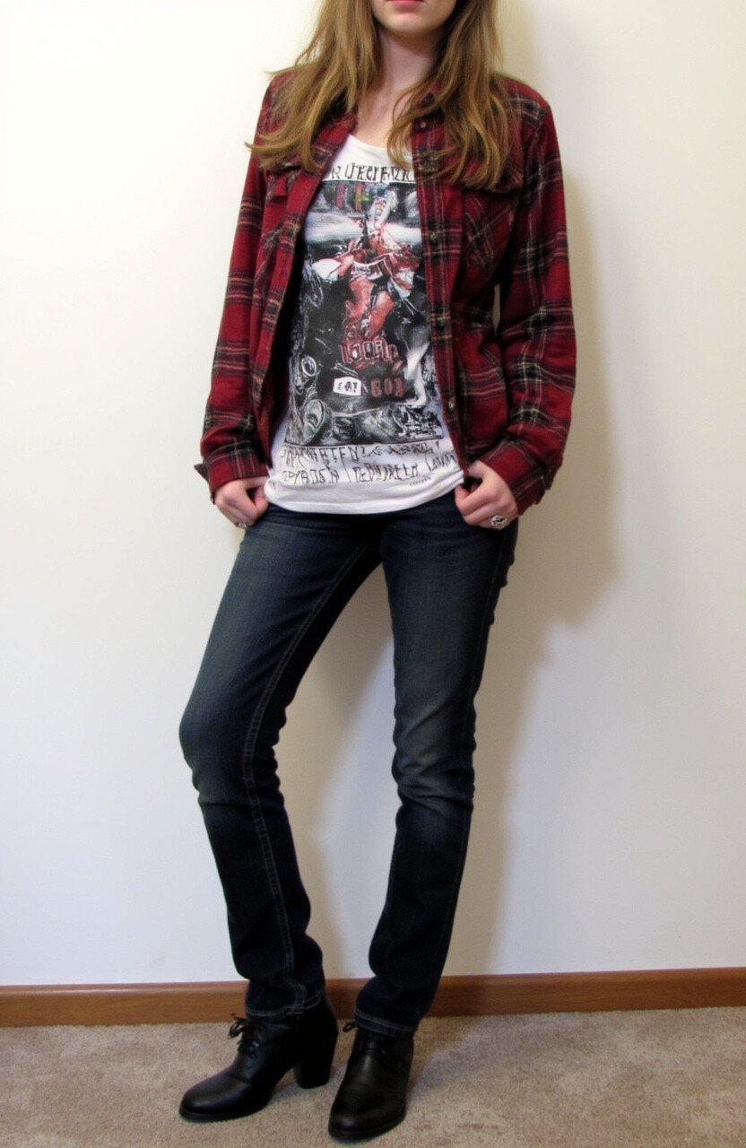 Flannels are affordable and come in various colors. This ensemble is both classic and adaptable.