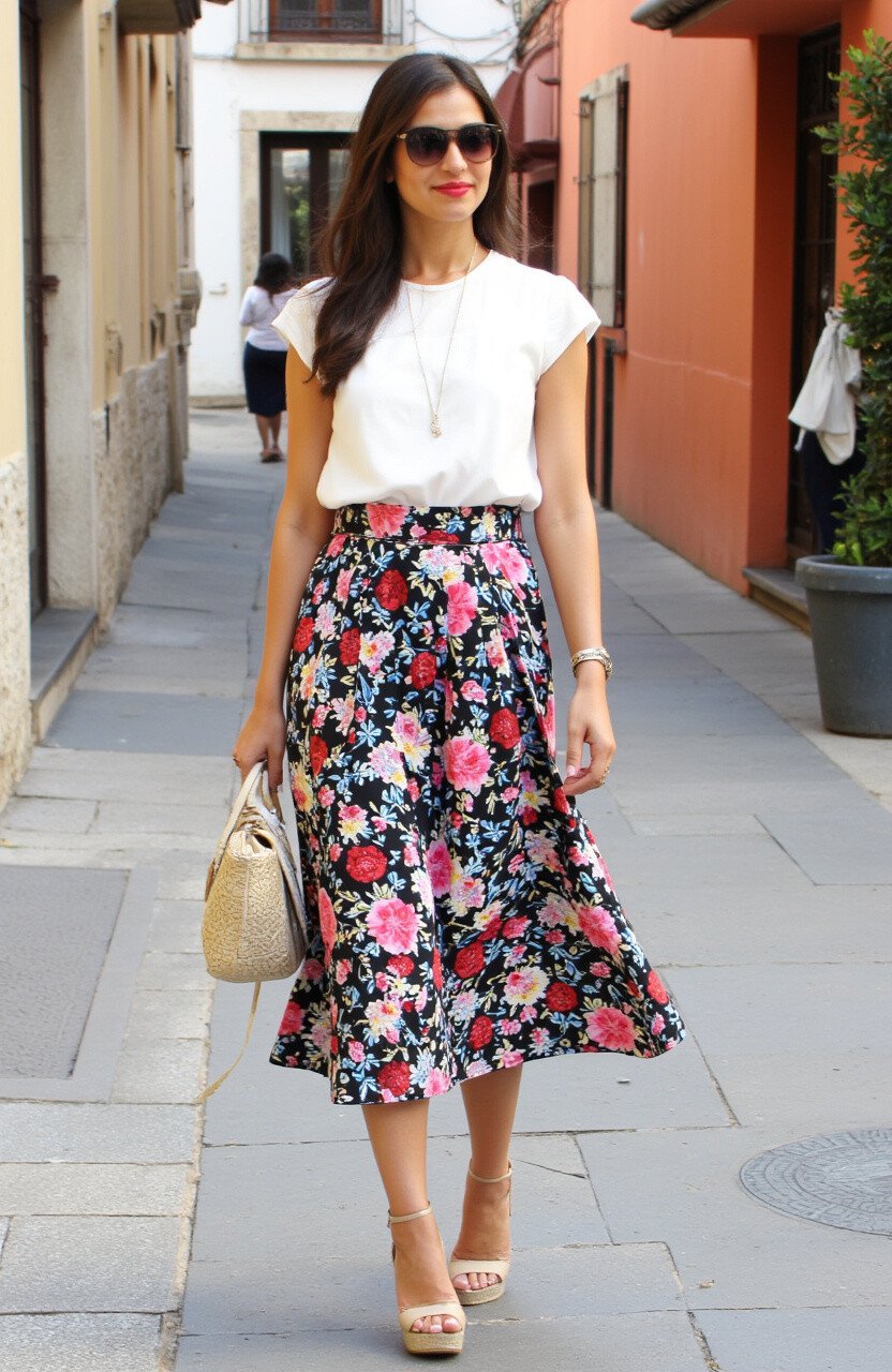 Floral prints are a summer favorite, and a Spanish-inspired midi skirt is just what you need. The vibrant colors mirror the lively spirit of a street fiesta.