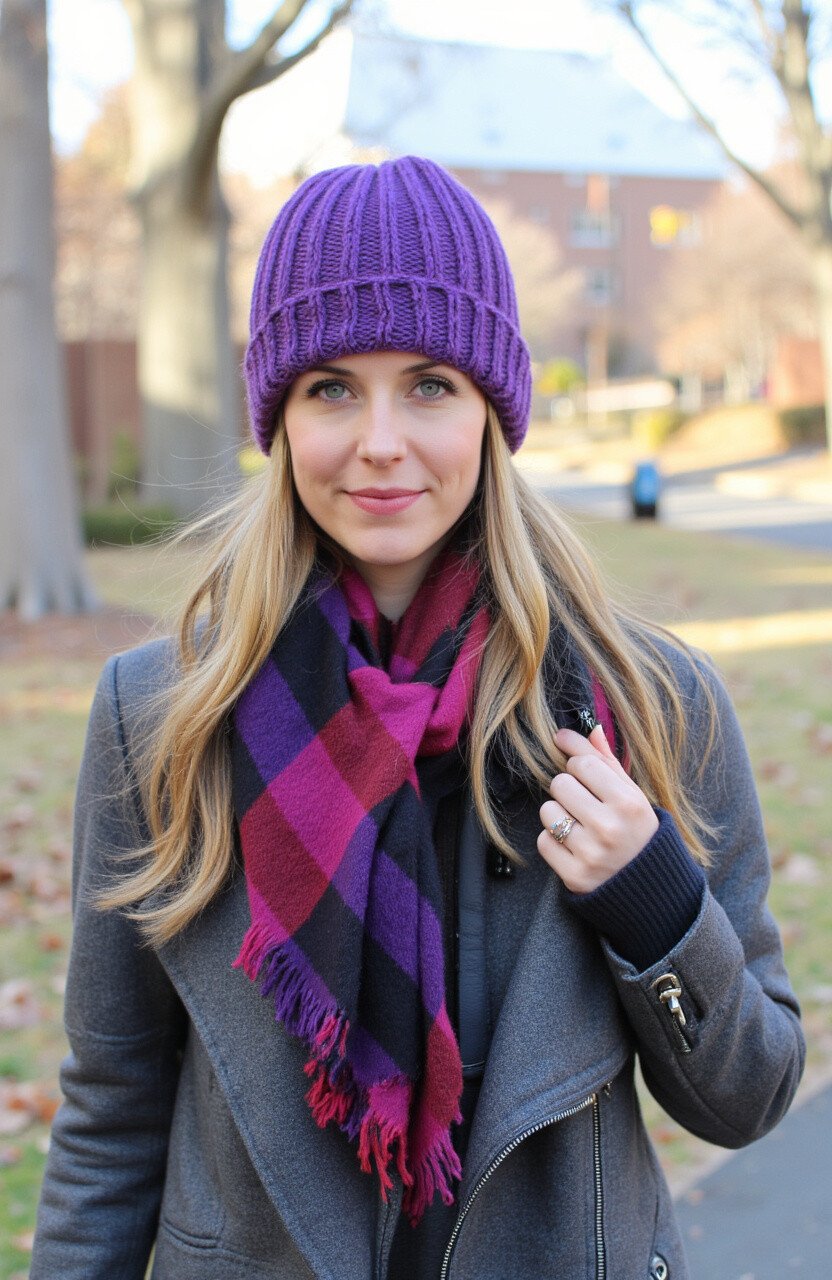 A knit beanie keeps your head warm and stylish. It’s an easy way to add texture to your look. Choose bold colors to brighten up your outfit.