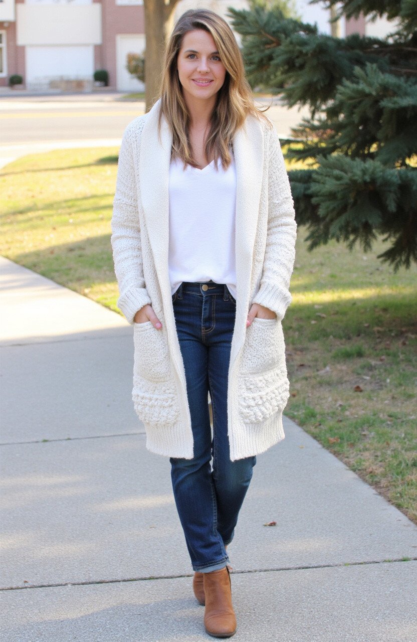 A longline cardigan is like wearing a stylish blanket. It adds warmth without bulk. Choose neutral colors to match any outfit.