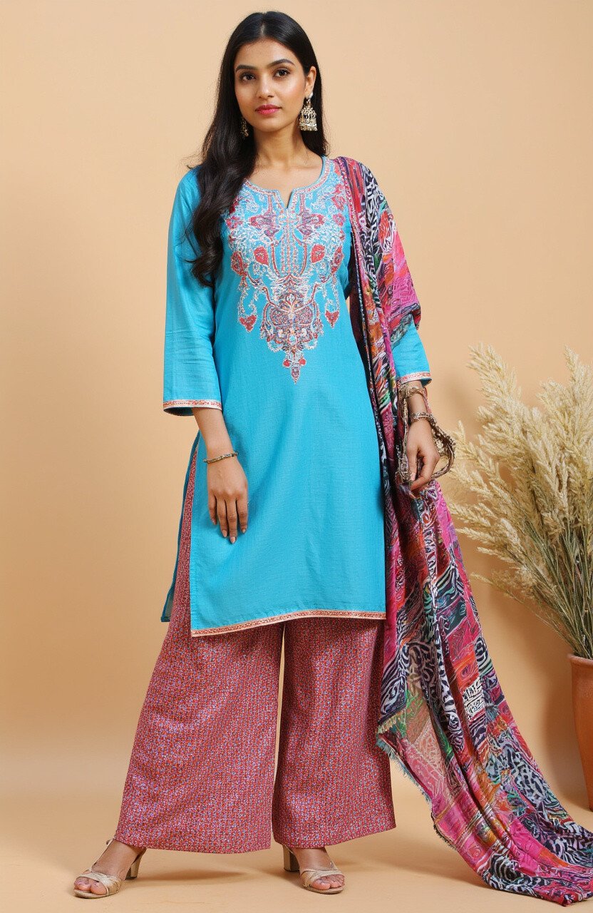 A kurti paired with palazzos offers a comfortable yet stylish option. This combo is perfect for those who prefer a more relaxed fit without compromising on style. Bright colors and prints can add a lively touch to this ensemble.