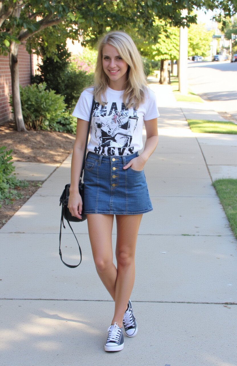 Make a statement with a bold graphic tee paired with your jean skirt. This outfit is perfect for expressing your individuality and having fun with fashion.