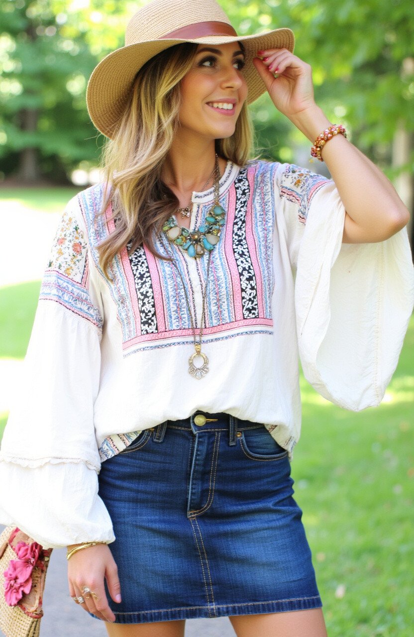 Channel your inner bohemian spirit by pairing a flowy blouse with your jean skirt. Think bell sleeves, intricate patterns, and soft fabrics that dance with the breeze. This combination is ideal for a picnic in the park or a casual brunch.