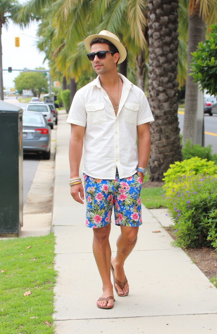 Bring vacation vibes to your wardrobe with a tropical outfit. Pair vibrant, floral shorts with a breezy linen shirt. Don’t forget the sunglasses and a straw hat.