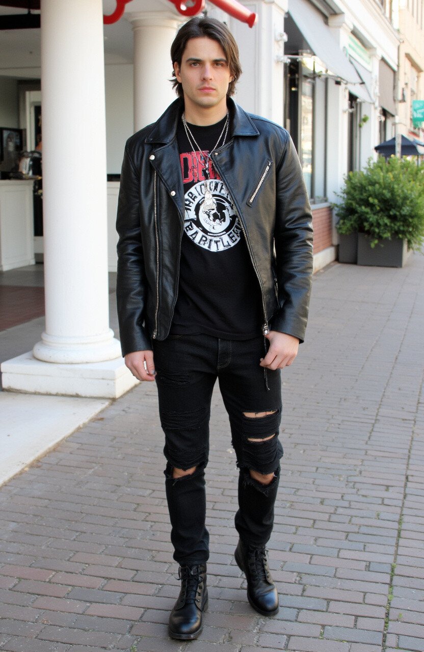 Let your rebellious side shine with a punk-inspired outfit. Think ripped jeans, a band tee, and a leather jacket. Combat boots add the perfect finishing touch.