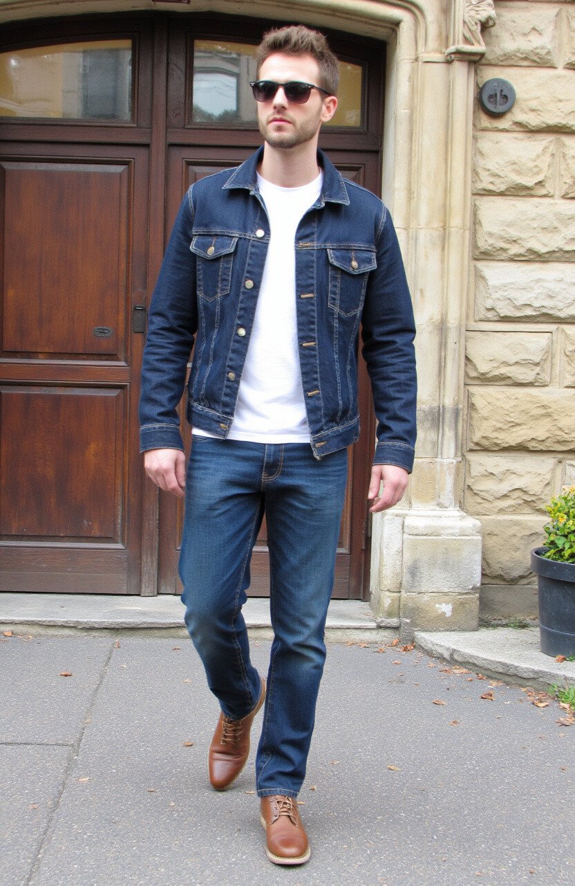 Denim never goes out of fashion. Pair your favorite denim jeans with a crisp white t-shirt and a dark denim jacket for a timeless look. This outfit is all about simplicity and effortless style.