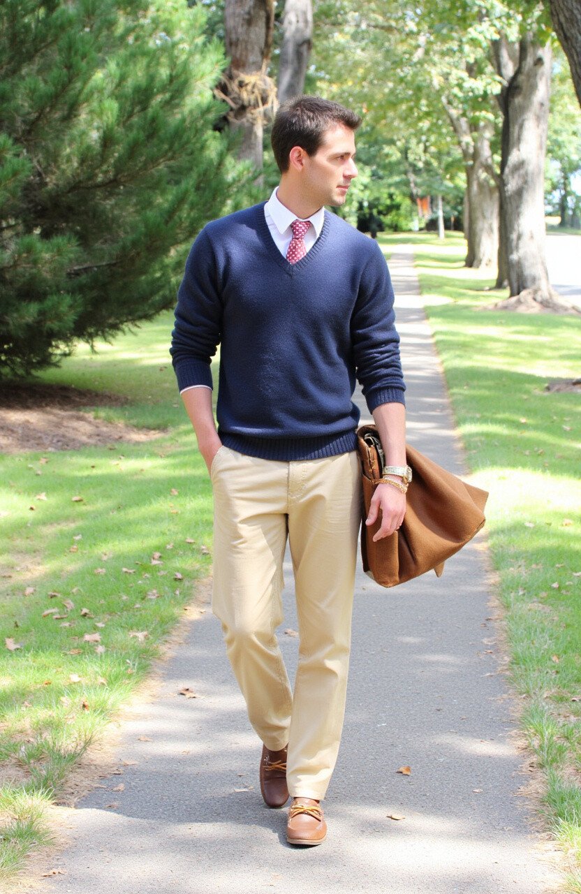 Embrace classic preppy style with a twist. Layer a sweater over a collared shirt and pair with khakis. Boat shoes complete the look, making it ideal for a day at the country club.