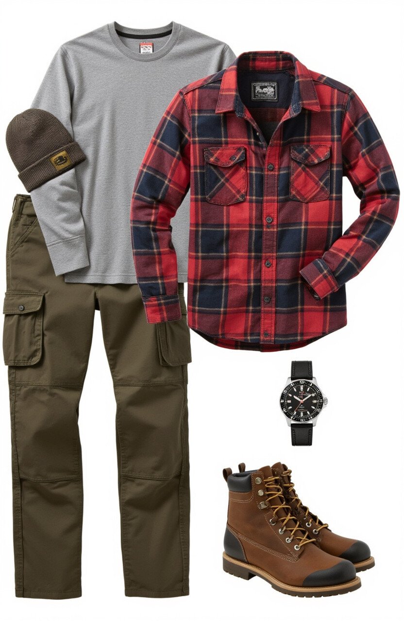 Embrace the call of the wild with a rugged, outdoorsy outfit. Layer a flannel shirt over a thermal tee and pair with cargo pants. Hiking boots add the finishing touch.