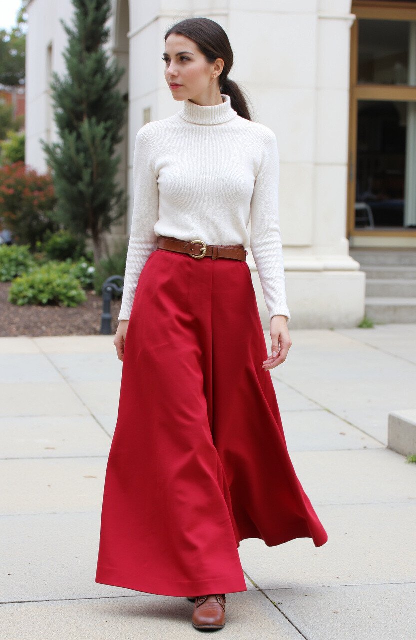 The classic turtleneck paired with a flowing maxi skirt offers a look that’s both timeless and chic. The high neck provides warmth and coverage, while the skirt adds a feminine touch. This outfit is perfect for a day at the office or a casual dinner.