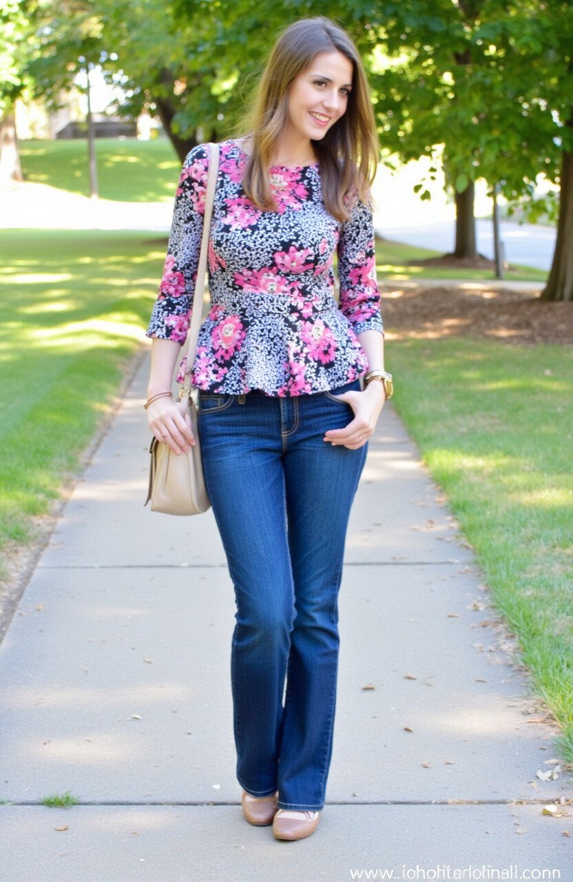 A peplum top paired with straight-leg jeans offers a playful and modern look. This outfit is perfect for casual outings or a day at the park. The peplum adds a fun twist, while the jeans keep things grounded.