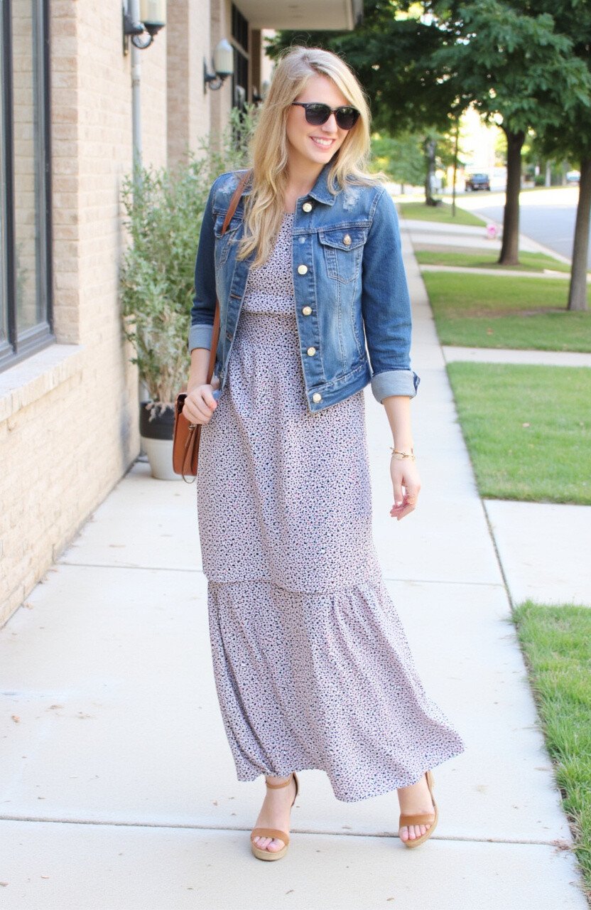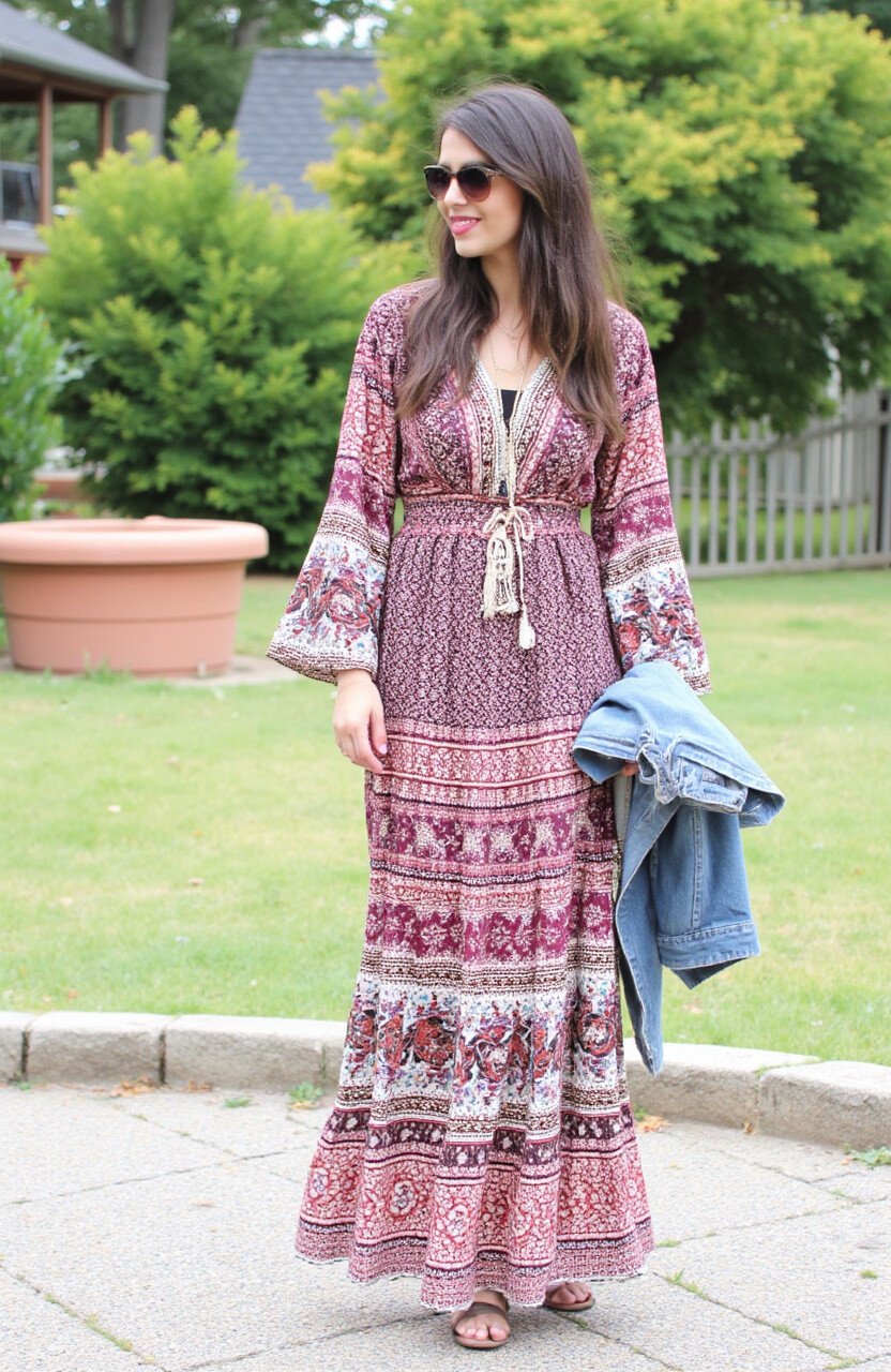 This look is budget-friendly, with denim jackets and maxi dresses available at every price point. Look for cotton or polyester blends in dresses for durability and comfort.