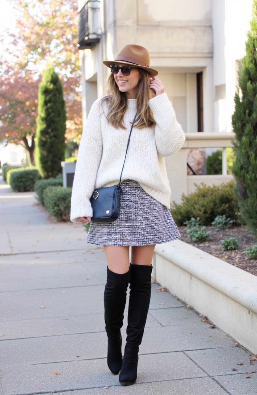 A cozy knit sweater paired with an A-line skirt creates a warm and inviting look. This outfit is perfect for cool days when you want to feel snug yet stylish. The sweater provides comfort, and the skirt adds a touch of femininity.