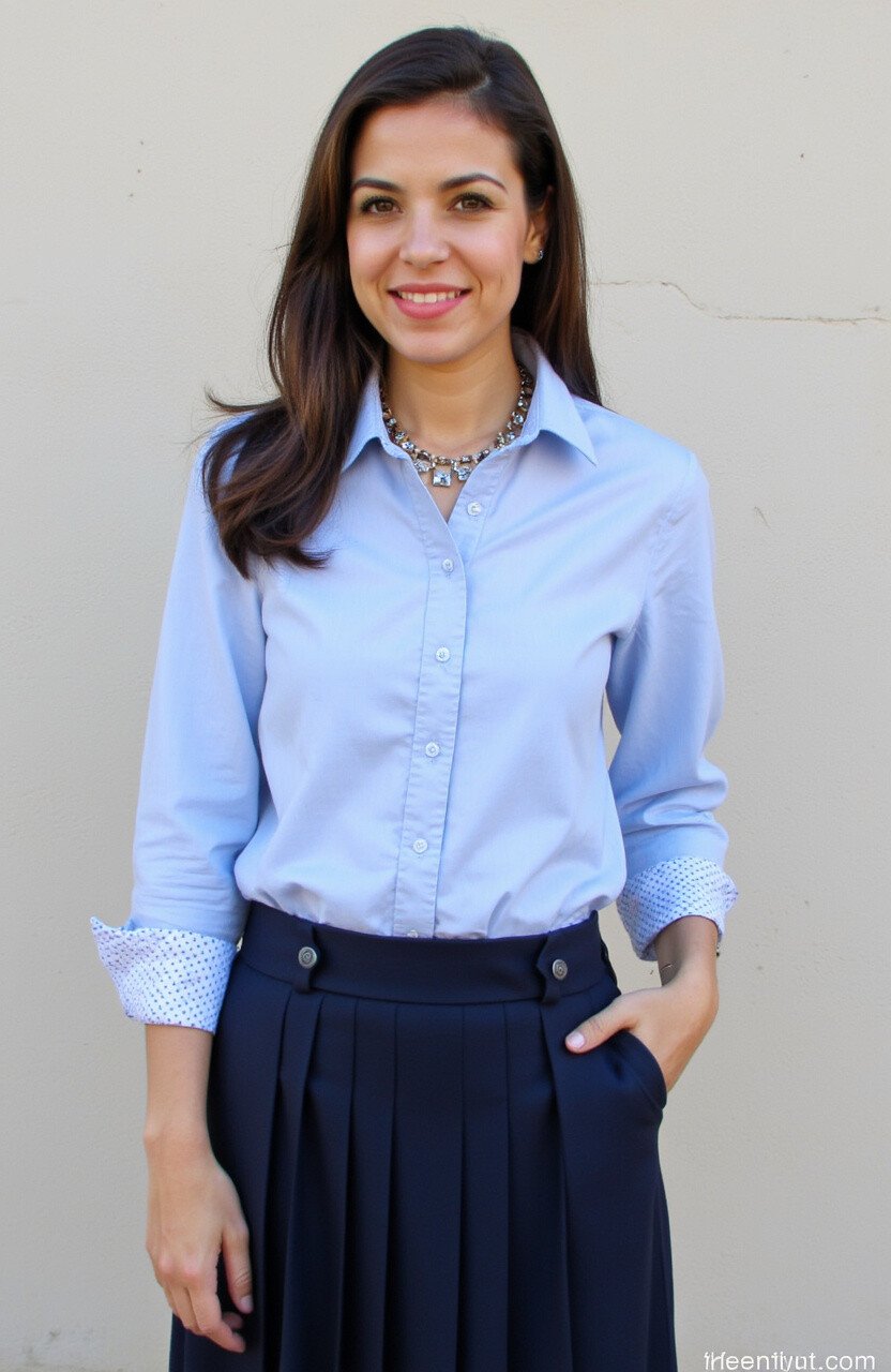 The combination of a crisp button-down shirt with a pleated midi skirt is a classic choice. This outfit exudes professionalism and is perfect for work or formal gatherings. The button-down adds structure, while the skirt brings a touch of grace.