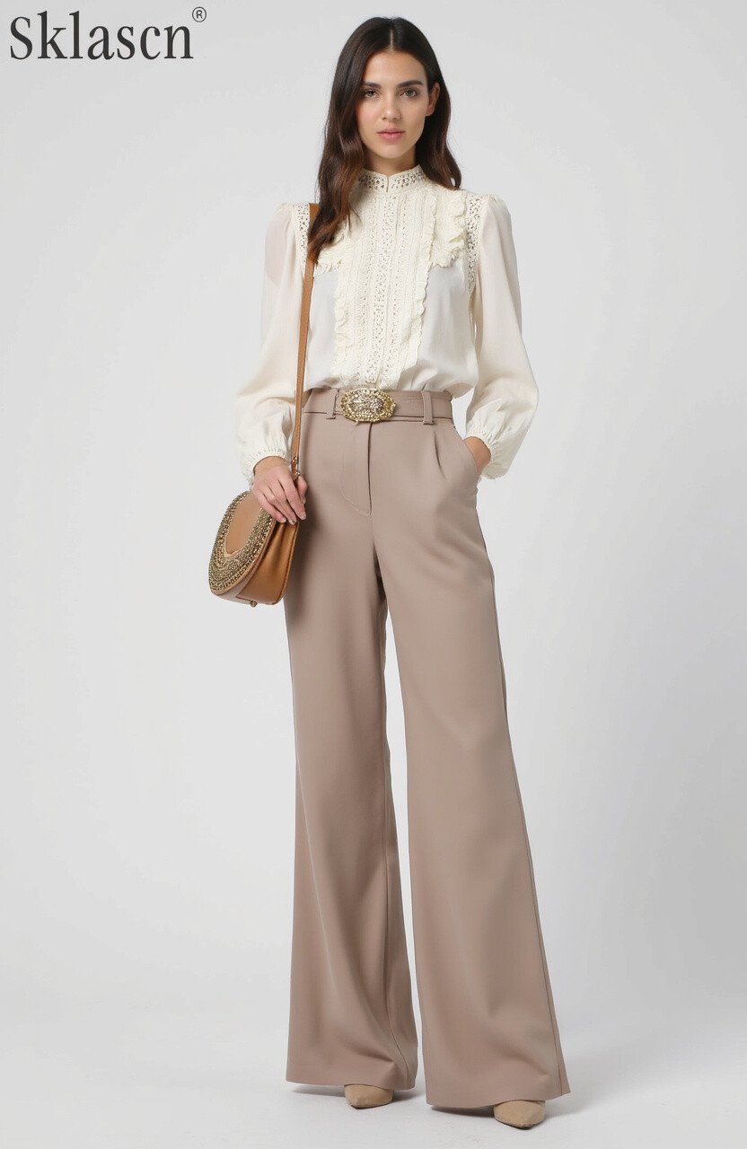 A high-neck blouse combined with palazzo pants offers a sophisticated and modern look. This outfit is suitable for formal events or a day at the office. The blouse adds elegance, while the pants offer comfort and movement.